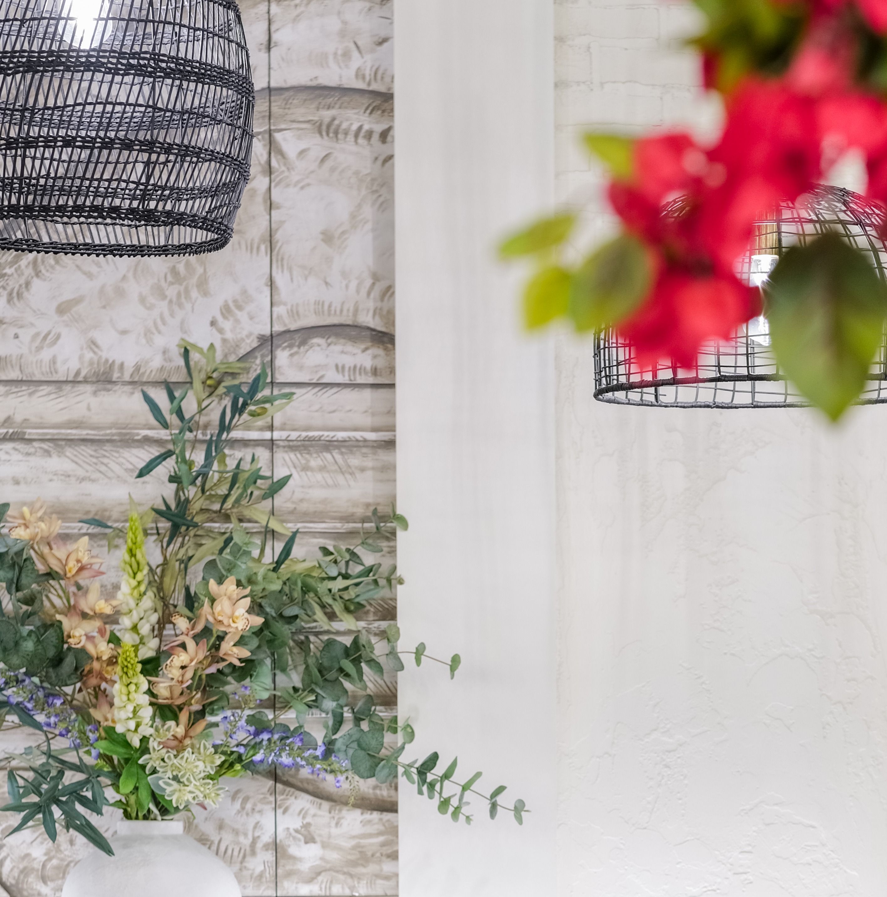 Our private dining room, Villa, one large round table accommodating up to 10 guests with a bougainvillea filled ceiling and cabinets showcasing our wine selection. An accordion door opens to an adjoining outdoor area, which can seat an additional 12 guests at 1 long table or be used as mingling space prior to sitting for dinner.